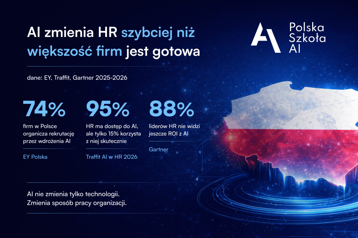 Z danych EY Polska wynika, że w 2025 roku 74% organizacji w Polsce ograniczyło rekrutację w związku z implementacją sztucznej inteligencji (III edycja raportu „Jak polskie firmy wdrażają AI?”, Q4 2025, N=499). Jednocześnie: